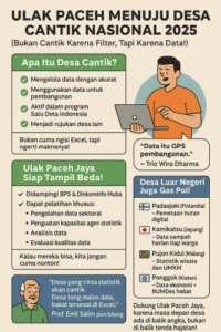 Karena kata pepatah baru yang kami buat khusus “Desa yang cinta statistik akan cantik, desa yang abai data akan merana dipojokan Excel.”. Jadi mari kita semangati operator dan agen statistik Ulak Paceh Jaya, siapa tahu, 2025 nanti bukan cuma jadi tahun politik nasional, tapi juga jadi tahun Statistik Bersemi di Tanah Ulak.[***]